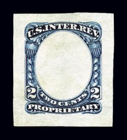 979 E Turner Essay 116 var. imageTurner Essay 116 var., 10c Blue Proprietary, die essay of frame on India paper, 26x32mm, another sound and extremely rare frame essay, being a value that is not listed in Turner, intense deep color and a razor-sharp impression, extremely fine; quite likely unique; ex-Joyce. (Image) Est. 300-400