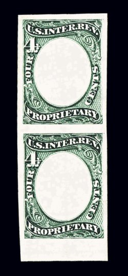 977 E Turner Essay 115A imageTurner Essay 115A, 4c Green, plate essay of frame on card, bottom sheet-margin vertical pair, large even margins on the other three sides also, fresh with rich color, extremely fine. (Image) Est. 150-200