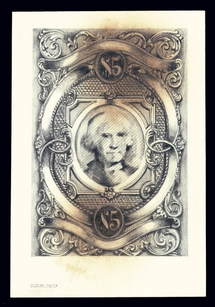 980 E image$5.00 Proprietary, detailed pencil artist's drawing, on wove paper, measuring 128x186mm, the frame is very similar to the issued design but varying in small details, no lettering has been incorporated into the top, bottom and side ribbons but with "$5" at top and bottom, it is clear from the detail that the artist was designing the frame, includes a less detailed vignette of Washington that is totally unlike the vignette used, signed with the designer's intitials "J.D.B. 1873" at bottom, two brown spots which are undoubtedly scorch marks from a candle type light table, one with slight break, otherwise very fine and certainly unique; a very rare artist's drawing, very few of which are known for any revenue design; unlisted in Turner. (Image) Est. 1,500-2,000