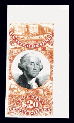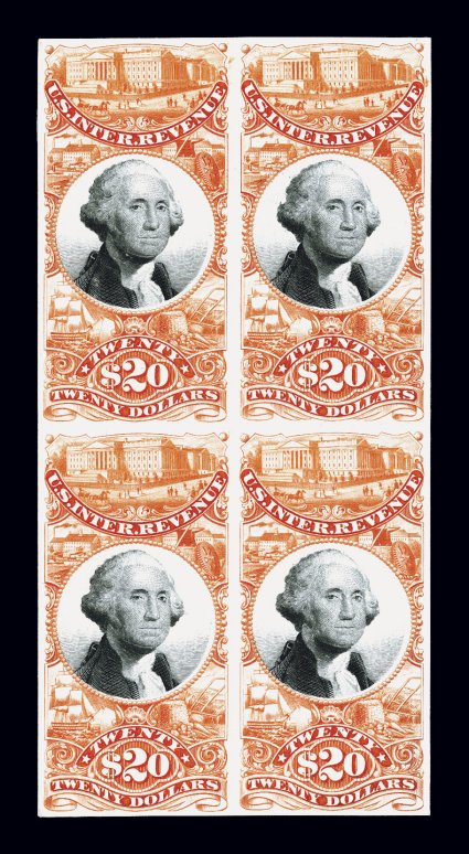 1143 Pbl R150P4 image#R150P4, $20.00 Orange and black, plate proof on card, pristine block of four of this key high denomination revenue proof, large full and even margins all around, excellent colors and impressions on fresh white card, extremely fine. (Image) $635.00