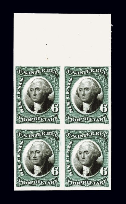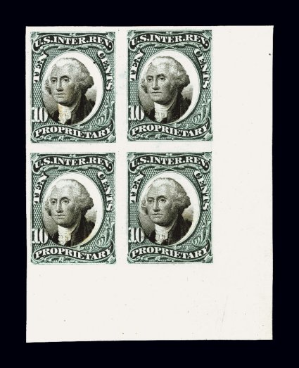1146 Pbl RB1P4-7P4 image#RB1P4-7P4, 1c -10c Proprietary revenues, plate proofs on card, cplt. in blocks of four, a choice set of all the values that come in blocks of four, sumptuously large margins, fresh with rich colors and nice impressions, extremely fine. (Image) $364.00