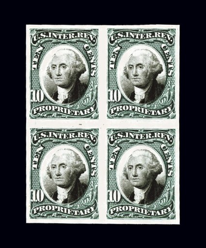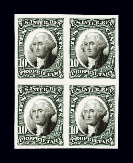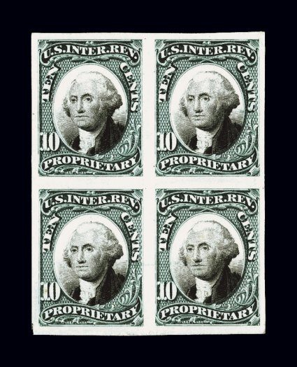 1147 Pbl RB1P4-7P4 image#RB1P4-7P4, 1c -10c Proprietary revenues, plate proofs on card, cplt. in well margined blocks of four, large to extra-large margins all around, fresh with rich colors and sharp impressions, extremely fine. (Image) $364.00