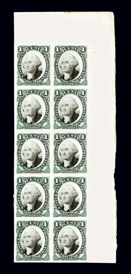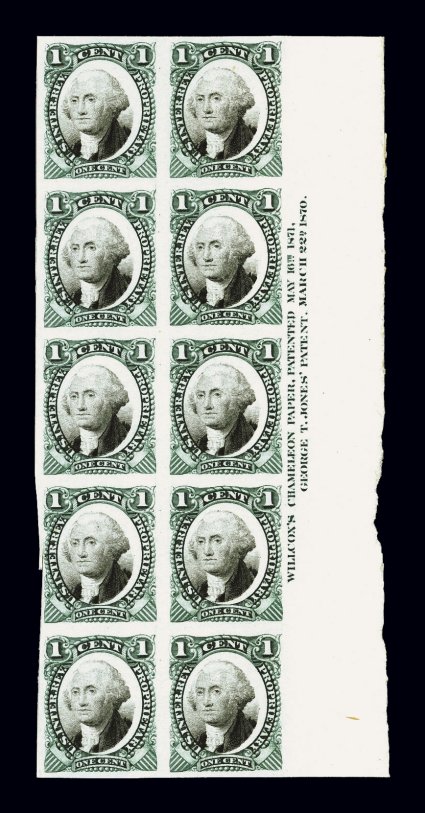 1154 Pbl RB1P4 image#RB1P4, 1c Green and black, plate proof on card, right margin inscription block of ten with "Willcox Chameleon Paper, Patented May 16th. 1871/George T. Jones' Patent. March 22d. 1870" two line inscription, mostly large margins, just touching at one proof, very fine and scarce inscription block. (Image) Est. 200-300