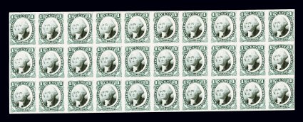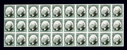 1151 Pbl RB1P4 image#RB1P4, 1c Green and black, plate proof on card, block of 30 (10x3), well clear to large margins all around, bright colors and clean impressions, very fine-extremely fine and handsome multiple; cataloged as blocks of four and singles. (Image) $380.00+