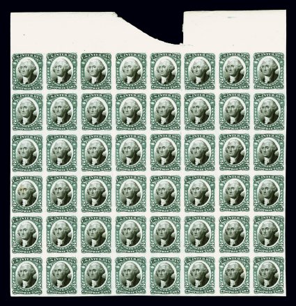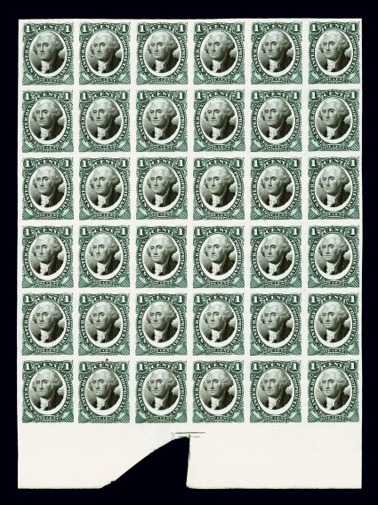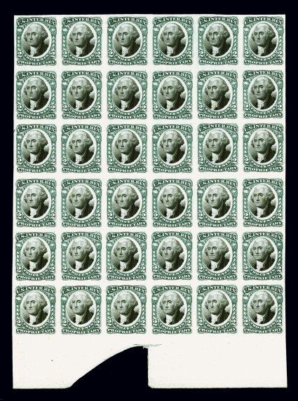 1159 Pbl RB2P4 var. image#RB2P4 var., 2c Green and black, plate proof on card, top sheet-margin block of 36 (6x6), with registration markers and cutout in the selvage, the left stamp and the third stamp from the left in the top row each show a major double transfer of the frame, positions 3 and 5 in the plate of 210, these are both much more pronounced than most double transfers showing doubling of numerous lines all over the frame, block with large margins all around, rich colors and detailed impressions showing the double transfer well, extremely fine; an important position piece for the student of this issue; cataloged as twelve normal blocks of four. (Image) $624.00