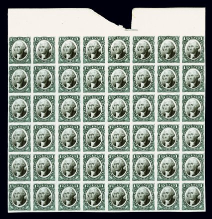 1153 Pbl RB1P4 image#RB1P4, 1c Green and black, plate proof on card, top margin block of 48 (8x6) with registration markers and cutout, large to extra-large margins on the other three sides, rich colors and strong impressions, extremely fine; cataloged as twelve blocks of four. (Image) $624.00