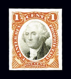 1142 P R150P4 image#R150P4, $20.00 Orange and black, plate proof on card, handsome top left corner margin single, plus huge margins on the other two sides, intense deep colors and razor-sharp impressions, extremely fine; an extraordinarily choice example of this key high value. (Image) $150.00