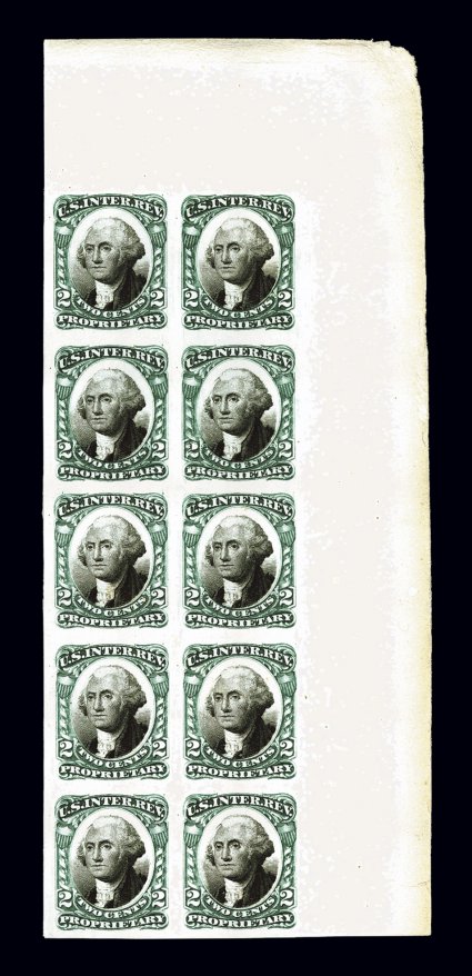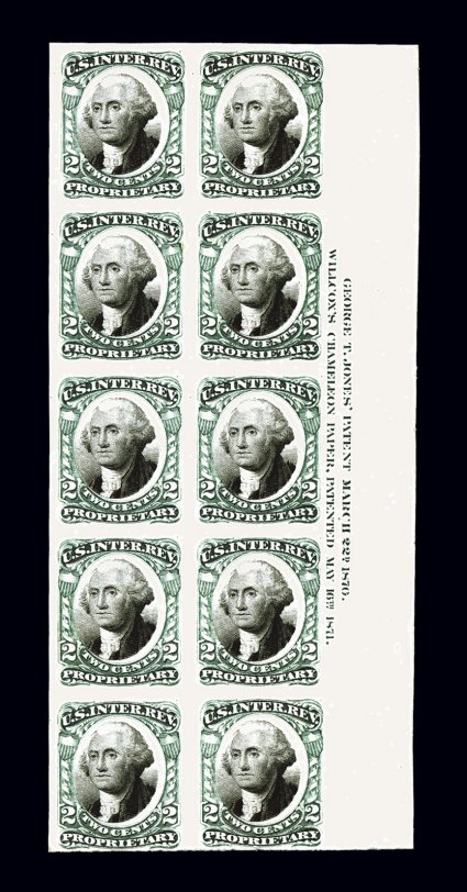 1160 Pbl RB2P4 image#RB2P4, 2c Green and black, plate proof on card, right sheet-margin inscription block of ten with "Willcox Chameleon Paper, Patented May 16th. 1871/George T. Jones' Patent. March 22d. 1870" two line inscription, clear to exceptionally large margins on the other sides, lovely colors and sharp clean impressions, very fine and choice; very scarce position piece. (Image) Est. 200-300