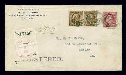 21 c 354 image#354, 4c Orange brown coil, perf. 12 vert., high quality pair with 2mm spacing, in combination with 2c Carmine coil single (#349), tied to registered cover to Butler, Pa on June 9,1909, the earliest documented usage of the 4c Orange brown coil, stamps are tied by Chicago, Ill. ovals with red registry c.d.s. of that city at left on the limited-use experimental Form 1549-A registry label, backstamped two days later, very fine; an exceptionally rare and unusual franking in its own right, making this an outstanding earliest documented usage cover; 1989 PF certificate; ex-Hadley. (Image) Est. 1,500-2,000