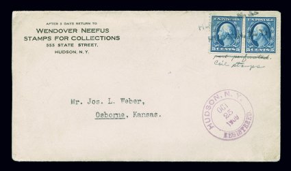 22 c 355 image#355, 5c Blue coil, perf. 12 vert., scarce pair with bright color and quite well centered, on registered cover being the October 25, 1909 earliest documented usage, stamps are tied by most unusual black "Hudson, N.Y." straight line cancels, registry c.d.s. of Hudson below, posted to Osborne, Kans., with enclosure, very fine and an unusually rare franking in addition to its earliest documented usage status; 1989 PF certificate; ex-Hadley. (Image) Est. 1,500-2,000