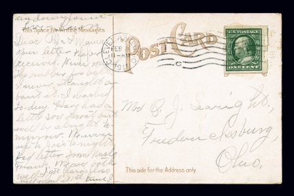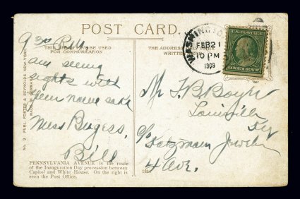 24 c 357 image#357, 1c Green on bluish paper, well centered single (natural s.e. at bottom) on picture post card of Pennsylvania Avenue in Washington, D.C., February 21, 1909 earliest documented usage, tied by Washington, D.C. duplex with exceptionally clear date, posted to Louisville, Kentucky by a tourist, very fine for this and exceptionally early usage being within five days of when the stamp was purported to have been issued; 2004 APS certificate. (Image) Est. 1,500-2,000