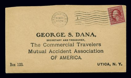 25 c 358 image#358, 2c Carmine on bluish paper, fresh single (s.e. at top) on return envelope of the Commercial Travelers Mutual Accident Association being the February 23, 1909 earliest documented usage, within a week of the February 16, 1909 date when this value supposedly went on sale, stamp is tied by neat Washington, D.C. machine cancel, backstamped Utica, N.Y. the next day, crisp and very fine; even the low values of the bluish papers saw little use and the earliest documented usage is a highly important find for the Washington-Franklin specialist; 1993 AFDCS certificate; ex-Hart. (Image) Est. 3,000-4,000