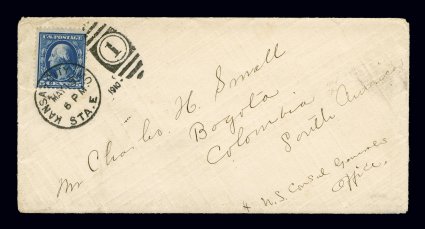 26 c 361 image#361, 5c Blue on bluish paper, an attractive single of this rarity, possessing rich sumptuous color on distinctively blue paper, pleasingly fine centering, wonderfully tied to handsome cover to Bogota, Colombia through the U.S. Consul General's Office by a perfect strike of a "Kansas City, Mo./May 18, 1910" duplex pmk., this being the May 18, 1910 earliest documented usage of the very few known used stamps or covers, large oval Bogota receiving cancel on the reverse, certainly very fine and an impressive usage.The 5c Blue stands alone of all the regularly issued bluish papers being, by far, the rarest of the values, particularly when it comes to the used stamps including those on cover. It is believed that only a total of five examples are known used, three of which are on cover. Of this miniscule accounting both of the other covers (one of which is the same correspondence as this) and the two used singles either have straight edges or faults or both.The cover offered here is by far the finest known cover of this phenomenally rare stamp. In condition it is miles ahead of the other used copies. It is certainly one of the most attractive of the three covers making a wonderful addition, and certain to acquire a prominent position in even the most advanced collections. All of which is capped off by being the earliest documented usage giving this cover unparalleled appeal. Accompanied by two 1993 PSE and 1995 PF certificates; ex-"Lake Shore" collection. (Image) Est. 20,000-30,000
