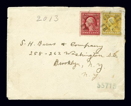 27 c 364 image#364, 10c Yellow on bluish paper, an enormously rare postally used single along with 2c Carmine (#332, both with natural s.e.), tied to petite registered cover by fancy geometric crossroads cancel, posted on February 3, 1910, the earliest documented usage, from Stapleton, N.Y. with that town's violet registry c.d.s., New York city transit oval and backstamped Brooklyn, N.Y., all three clearly bearing the February 3rd, 1910 date, small cover edge faults and accompanying PF certificate mentioning small flaws at the top left of the stamp, which we are hard pressed to find, a fine and desirable cover. It is quite likely that next to the 5c, the 10c is the next most elusive stamp to find in used condition. Johl explains the frequency with which this relatively scarce value is found, attributing the ease with which it is found to the pale yellow color contrasting with blue paper and making them stand out. Apparently they were recognized before they were used as a tally of the known copies reveals only twelve used singles, plus three covers with singles have been certified by the Philatelic Foundation. This cover count exactly matches the number of covers with the 5c value.Thus we are pleased to offer the other great cover rarity in the bluish papers, testifying to the extensiveness of the earliest documented usage covers contained in the "Alpha" collection. This value is listed by Scott on cover but unpriced. Accompanied by a 1992 PF and a clear 1998 APS certificate. (Image) Est. 15,000-20,000