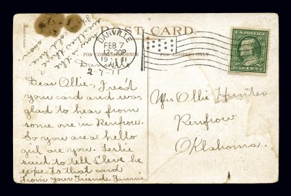 28 c 374 image#374, 1c Green, well centered single (natural s.e. at left), tied to multicolor Valentine card by well applied Danville, Ill. flag machine cancel, February 7, 1911 earliest documented usage, posted to Renfrow, Oklahoma, stamp lifted for identification and hinged in place, stains and other small flaws to card, fine; 2005 APS certificate. (Image) Est. 750-1,000