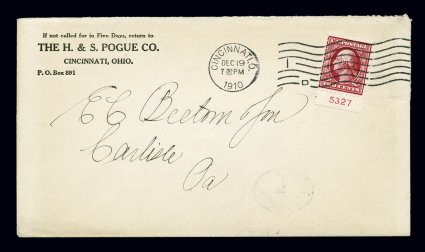 30 c 375 image#375, 2c Carmine, bottom margin plate no. 5327 single, December 19, 1910 earliest documented usage, stamp tied to clean corner card cover of The H. & S. Pogue Co., beautifully printed Cincinnati, Ohio machine cancel and equally attractive Carlisle, Pa. duplex backstamp the next day, very fine and attractive cover, used within a month of the believed issuance date; 2003 APS certificate. (Image) Est. 1,000-1,500
