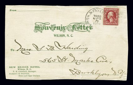 31 c 375a image#375a, 2c Carmine booklet pane single, tied to cover front of a souvenir letter or folder from the New Briggs Hotel in Wilson, N.C., which probably contained photo cards of the area, stamp tied by Washington & Fayetteville R.P.O duplex, May 10, 1911 earliest documented usage for the booklet pane stamp, posted to Brooklyn, N.Y., stamp lifted for proper identification and hinged in place, small edge flaws to front, fine; clear 2005 APS certificate. (Image) Est. 500-750