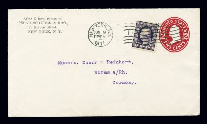 32 c 376 image#376, 3c Deep violet, Ty. I, attractive fine single with remarkably deep color, tied to 2c Carmine on white entire (#U411) making the international letter rate to Germany, June 9, 1911 earliest documented usage, stamp tied by clean New York, N.Y. machine cancel, exceptionally fresh and very fine cover; 2003 APS certificate. (Image) Est. 1,000-1,500