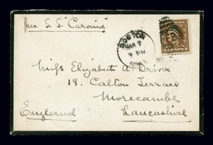 33 c 377 image#377, 4c Brown, single franking paying the double international treaty rate to England (quite uncommon), tied to mourning cover by Boston duplex dated March 7, 1911, the earliest documented usage, Morecambe, Lancashire backstamp on March 16, 1911 confirming the month and year, very fine cover making an attractive exhibition item; 2001 APS certificate. (Image) Est. 1,000-1,500
