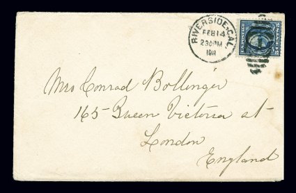 34 c 378 image#378, 5c Blue, a neatly tied single on cover to England paying the standard UPU letter rate, February 14, 1911 earliest documented usage cover being very close to the January 25, 1911 date of issuance, minor cover flaws, stamp lifted to confirm identification, nearly very fine; 2001 APS certificate. (Image) Est. 1,000-1,500