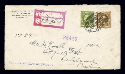 35 c 380 image#380, 8c Olive green, well centered single, along with 4c Brown (#377), tied to registered return-receipt cover to Oakland, Cal. by New York, Grand Central Station oval, June 13, 1911 earliest documented usage with magenta registry ovals of that date on the reverse, backstamped, stamp lifted for identification and hinged in place, minor flaws to stamps and cover, of little consequence to this earliest documented usage, nearly very fine; clear 2005 APS certificate. (Image) Est. 1,000-1,500