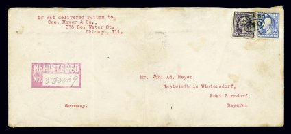 36 c 382 image#382, 15c Pale ultramarine, along with 3c Violet (#333), singles of each tied to large registered cover to Germany by Chicago, Ill. oval, April 25, 1911 earliest documented usage, registry c.d.s. of the Chicago Southwater Station of that date on reverse, New York transit oval the next day and backstamped Zirndorf in Bavaria, vertical folds to the cover and light toning slightly affecting stamps, all of which is quite irrelevant to this earliest documented usage, fine; 2004 APS certificate (erroneously stating 4/27/1911 which has carried over to the Scott catalog). (Image) Est. 750-1,000