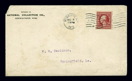 38 c 384 image#384, 2c Carmine imperforate, well centered single with Schermack Ty. III private perforations, December 8, 1910 earliest documented usage, neatly tied to corner card cover of the National Collection Co. by Milwaukee, Wis. machine cancel, backstamped Springfield, La, stamp lifted to confirm identification, very fine; this is the earliest documented usage, not only for the Shermack variety, but for the sheet imperforate as well, in fact this date substantially predates Johl's January 3, 1911 date of issue and even estimates that were as early as December 10, 1910; 2001 APS certificate. (Image) Est. 1,000-1,500