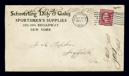 39 c 384V image#384V, 2c Carmine imperforate coil, vertical format, attractive single being well centered with large margins, October 21, 1910 earliest documented usage, stamp applied by Simplex affixing machine and tied to Schoverling Daly and Gales Sportsman's Supplies corner card cover by New York, N.Y. machine cancel, backstamped Suffolk, Va. the next day, some contemporaneous doodling, mostly on the reverse, very fine; this government issued coil actually predates the sheet imperforates by six weeks and is in fact the earliest documented usage of any single line watermarked stamp, making this a highly important cover for the postal history collector of the Washington-Franklin issues; 2003 APS certificate. (Image) Est. 3,000-4,000