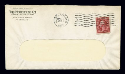40 c 384H image#384H, 2c Carmine imperforate coil, horizontal format, lovely single with especially intense deep color, March 9, 1912 earliest documented usage, applied to The Morehouse Co. corner card window envelope by Multipost plunger-style affixing machine, stamp is tied by Cleveland, Ohio machine cancel, clean and very fine cover; an incredibly rare cover as this is one of only two recorded covers with this government issued coil; 2004 APS certificate. (Image) Est. 2,000-3,000