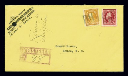 61 c 416 image#416, 10c Orange yellow, well centered single, with fresh deep color, tied to locally run commercial registered cover of House, New Mexico along with 2c Carmine (#375), February 12, 1912 earliest documented usage, stamps are tied by the four bar obliterator portion of the duplexes of House, New Mexico as found on reverse, enclosure contesting a homestead land claim in New Mexico, returned to sender undelivered, spindle hole at left, very fine and attractive; an unusual usage just after New Mexico statehood; 1998 APS certificate. (Image) Est. 1,000-1,500