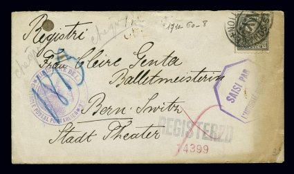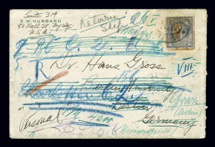 62 c 418 image#418, 15c Gray, single (natural s.e. at right and stained) tied to much travelled registered cover to Germany by New York registry oval, April 26, 1912 earliest documented usage, red registry c.d.s of origin from the Wall Street Station in New York on that date, then forwarded around Germany and Austria, and finally returned to the sender, fine and interesting cover of this earliest documented usage; 1999 APS certificate. (Image) Est. 750-1,000