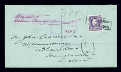 63 c 422 image#422, 50c Violet, double line watermark, a marvelous single-franking cover, the stamp is especially attractive being exceptionally well centered and possessing a lovely strong pastel color, tied to attractive blue registered return-receipt cover to England by boxed "Vera Cruz, Mexico/U.S. Mail Agency" handstamp, with registry c.d.s. of this foreign United States post office on the reverse, this being the October 31, 1914 earliest documented usage, New York transit oval on the reverse as well, the stamp has been lifted for identification and hinged in place, a portion of the back flap is missing, not affecting any markings, very fine; this 50c high value is believed to be the only certified example on cover, then to have it be a single franking used out of the U.S. Mail Agency during the occupation of Vera Cruz, Mexico and registered to an overseas destination is an incredible usage in its own right, plus being the earliest documented usage makes this a fantastic exhibition cover for the finest of Washington-Franklin collections; 2000 PF certificate. (Image) Est. 5,000-7,500