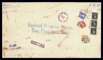 64 O 423 image#423, $1.00 Violet brown, bottom sheet-margin vertical strip of three, along with 50c Violet (#422), 30c Orange red (#420) and 10c Orange Yellow (#416), all mostly well centered, especially the $1.00 and 50c values, tied by Washington, D.C. oval pmks. on 320mm x 180mm large piece of a registered package which is apparently the full front, sent to the Federal Reserve Agent in San Francisco from the Controller of the Currency, violet "Washington, D.C./Jul 15, 1915/ Registered" c.d.s., making this the July 15, 1915 earliest documented usage of the scarce $1.00 value, very fine and impressive.One of the little recognized attributes of the United States Postal system was the amazing security that the federal government established in its registered mail system, prosecuting vigorously theft and robbery. Even today one of the most secure means of shipment is by registered mail with its detailed checks and balances to insure delivery. The government has long made use of this service shipping currency, as was quite likely the case with this package, as well as stamps, coinage and even gold. This front demonstrates the legitimate usage of high denomination stamps. It is certainly a far more desirable commercial usage of the dollar value than the more usual parcel tag usage. An impressive showpiece which will greatly enhance an exhibition collection of earliest documented usages or Washington-Franklin heads; 2000 APS certificate; ex-Siskin. . (Image) Est. 7,500-10,000
