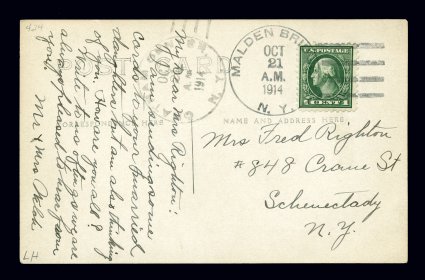 65 c 424 image#424, 1c Green, fresh single with bright color, tied to actual photo card by well struck Malden Bridge, N.Y. four-bar cancel, October 21, 1914 earliest documented usage, similar Chatham Center pmk. of the same date, posted to Schenectady, New York, exceptionally clean and attractive, very fine and choice; 2003 APS certificate; ex-Hart. (Image) Est. 750-1,000