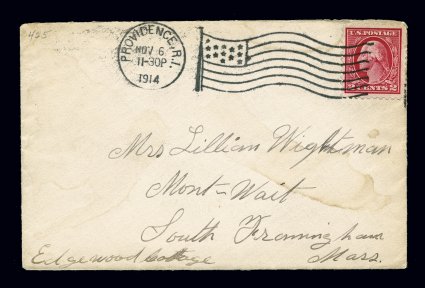 66 c 425 image#425, 2c Rose red, Ty. I, choice single with intense carmine color, tied to Lady's cover by Providence, R.I. flag machine cancel, November 6, 1914 earliest documented usage, posted to South Framington, Mass., very fine; 2001 APS certificate; ex-Hart. (Image) Est. 750-1,000