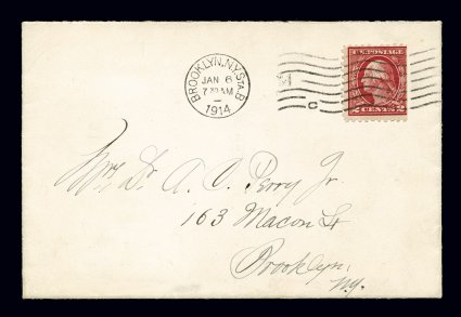67 c 425e image#425e, 2c Rose red, Ty. I, booklet pane single, neatly tied to petite locally run cover by Brooklyn, N.Y. machine cancel being the January 6, 1914 earliest documented usage, very fresh and attractive, choice very fine; this is one of those issues where the booklet panes predate the sheet stamps; the issuance date for the booklet pane is simply listed as January making the 6th a very early date if not a candidate for the first day of issue; 2003 PF certificate; ex-Fisher, Ahl. (Image) Est. 1,500-2,000