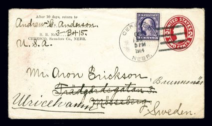 68 c 426 image#426, 3c Deep violet, Ty. I, beautifully centered single with rich deep color, tied to 2c Carmine on white postal entire (#U411) making the 5c international rate to Sweden, October 11, 1914 earliest documented usage, stamp tied by Ceresco, Nebr. four bar cancel, backstamped Mosseberg, Sweden, very fine and nice usage; 2001 APS certificate. (Image) Est. 1,000-1,500