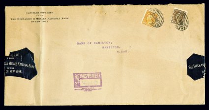 69 c 427 image#427, 4c Brown, along with 10c Orange yellow, both with perforated initials of The Mechanics and Metals National Bank, tied to large registered cover of that company by New York registry ovals, January 2, 1915 earliest documented usage with New York ovals of that date on the reverse, backstamped Hamilton, North Dakota, cover with fold at left and staple holes at top, fine earliest documented usage; 2001 APS certificate. (Image) Est. 1,000-1,500
