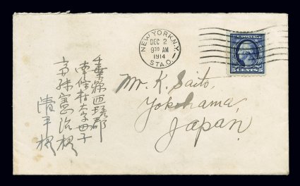 70 c 428 image#428, 5c Blue, single (natural s.e. at right) paying the 5c UPU rate to Japan, December 2, 1914 earliest documented usage, tied to cover by New York, N.Y. machine cancel, backflap missing, otherwise neat cover and nice usage, very fine; 2002 APS certificate. (Image) Est. 1,000-1,500