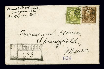 72 c 431 image#431, 8c Pale olive green, attractive single along with 4c Brown (#427) making a colorful franking on small registered cover, January 20, 1915 earliest documented usage, stamps tied by Washington, D.C. double oval with that city's Congress Heights Station registry c.d.s. on the reverse, backstamped Springfield, Mass., very fine and pretty cover; 2001 APS certificate. (Image) Est. 1,000-1,500