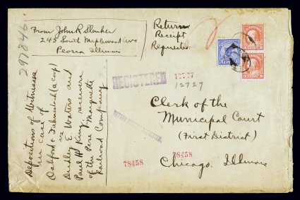 74 c 432 image#432, 9c Salmon red, vertical pair along with 10c Registration stamp (#F1; natural s.e. at left), tied to large court cover containing depositions concerning a case involving the Pere Marquette Railroad Company by registry ovals, February 25, 1916 earliest documented usage on cover, posted from Peoria, Ill. with registry c.d.s. of that date on the reverse, backstamped Chicago on the same day, normal edge wrinkles from the large enclosures, otherwise very fine; clear 2002 APS certificate. (Image) Est. 750-1,000