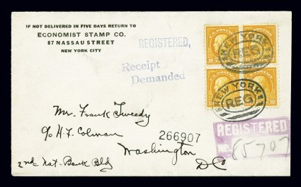 75 blc 433 image#433, 10c Orange yellow, lovely block of four, possessing exceptional centering and brilliant color, tied to registered return-receipt cover by New York registry ovals, November 13, 1914 earliest documented usage with New York, N.Y. registry ovals of that date on the reverse and backstamped Washington, D.C. the next day, very fresh and handsome cover, very fine and choice; blocks of four are not at all common on cover; 2002 APS certificate (Image) Est. 1,000-1,500