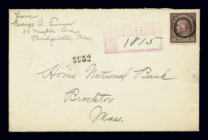 76 c 435 image#435, 12c Claret brown, well centered single (natural s.e. at left), on registered cover to Brockton, Mass., February 22, 1915 earliest documented usage with registry c.d.s. of Bridgewater, Mass. on reverse, backstamped, very fine; 2003 APS certificate. (Image) Est. 1,000-1,500