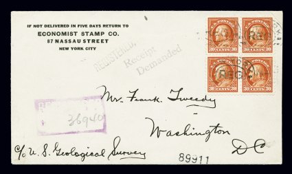 78 blc 439 image#439, 30c Orange red, brilliant block of four with eye-catching color, wonderfully well centered as well, tied to fresh registered return-receipt cover by New York double oval registry cancels, February 13, 1915 earliest documented usage with New York registry ovals of that date on the reverse, backstamped Washington, D.C. the next day, extremely fine and exceptionally attractive cover; this value is scarce on any cover and especially so with a block of four, when the earliest documented usage is added this all makes for a magnificent cover for the Washington-Franklin specialist; 2002 APS certificate. (Image) Est. 1,500-2,000