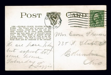 79 c 443 image#443, 1c Green flat plate coil, perf. 10 vert., well centered single tied to multicolor post card, June 19,1914 earliest documented usage, stamp tied by Detroit, Mich. machine cancel, posted to Columbus, Ohio, very fine; 2000 APS certificate. (Image) Est. 750-1,000