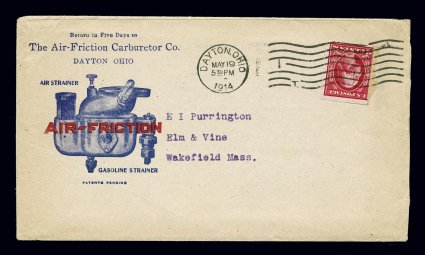80 c 444 image#444, 2c Carmine flat plate coil, perf. 10 vert., unusual single from the beginning of the roll showing a fragment of the manila leader tape at left, May 19, 1914 earliest documented usage, stamp tied to front and back illustrated advertising cover of The Air-Friction Carburetor Co. by Dayton, Ohio machine cancel, very fine; an important coil variety for the Washington-Franklin collector and predating the earliest documented usage listed by Scott by one day; 2004 APS certificate. (Image) Est. 1,000-1,500