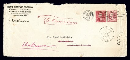 141 c 527 image#527, 2c Carmine offset, Ty. V, single in an unusual mixed franking with 2c Carmine engraved (#499), tied to commercial legal-size cover of the Kansas City Chapter of the Red Cross by Kansas City, Mo. machine cancel, April 20, 1920 earliest documented usage of the offset type V, double rate cover to the Philippine Islands, backstamped Arcao with Manilla and Cebu transits, returned undelivered, cover rather worn slightly affecting the stamp, still an interesting and very early usage as the first type V plate was not certified until March 20th and some time was necessary for production and distribution; clear 2001 APS certificate; ex-Hart. (Image) Est. 400-500