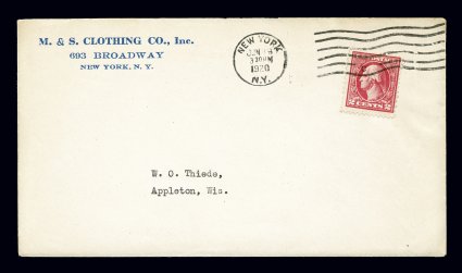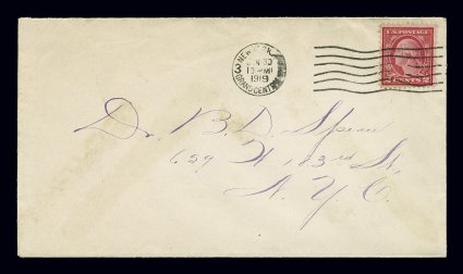 154 c 539 image#539, 2c Carmine rose coil waste, Ty. II, perf. 11x10, magnificent single featuring enormous margins for this issue, especially at top and bottom leaving no doubt as to its authenticity as this stamp is almost a full millimeter larger than the coil stamp, unusually well centered as well, rich characteristic carmine rose color, tied to cover used within New York city by New York, N.Y Grand Central Station machine cancel, June 30, 1919 earliest documented usage, an attractive cover of personal correspondence, very fine and remarkably choice.This especially scarce issue came about from a stack of sheets perforated 10 vertically that were too short to be made into coils for which they were intended. These sheets, known as "Coil Waste" were perforated gauge 11 at top and bottom so they could be distributed as sheet stamps. Most of these were of type III. However mixed in was a small number of sheets of unknown quantity of the type II. Time has proven this coil waste type to be very scarce. What is most surprising is that, while the mint stamps are scarce, used stamp are exceedingly rare. Our records show that we have offered several dozen mint singles plus three plate blocks, but only one used example. It is estimated that only about 25 used examples are known including the unique example on cover offered here.The Two Cent Carmine Rose, Type II, Perforated 11x10 on cover ranks as one of the great cover rarities of the 20th century. Scott lists a value of $30,000.00 for this specific item, which we believe to be grossly undervalued. A perspective to its value may be achieved when it is compared to another extremely rare Washington-Franklin type of the same period, the 2c Deep rose, Ty. Ia, imperforate (Scott #482A). The census of that rare stamp shows a total of 38 used examples, including three covers. The last recorded sale of one of these covers, being the earliest documented usage cover, was in the March 30, 2005 Alfred S. Martin Collection sold by Robert A. Siegel Auction Galleries, Inc. where it realized $160,000.00, plus 10% buyer's premium. It is our expectation that the far rarer #539 cover offered here will bring an eye-popping price since no Washington-Franklin postal history collection is complete without it. Accompanied by 1994 PF, 1997 PSE and 1998 APS certificates. (Image) Est. 40,000-50,000