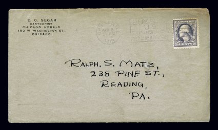 143 c 529 image#529, 3c Violet offset, Ty. III, single tied to corner card cover of E.C. Segar, Cartoonist, Chicago Herald, posted to Reading, Pa., Apr. 8, 1918 earliest documented usage, stamp tied by Chicago, Ill. machine cancel, some edge wear and discoloration slightly affecting the stamp, fine and early cover as Johl reported the issuance date as March 23rd; because of the Scott order and the attention drawn to the different types of the 2c offset issues few realize that this 3c value was issued almost exactly two years prior to the first 2c value; clear 2000 APS certificate. (Image) Est. 750-1,000