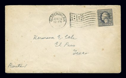 144 c 529a image#529a, 3c Violet offset, Ty. III, double impression, nice single showing two distinct impressions, tied to cover to El Paso, Texas by Claremont, N.H. flag machine cancel being the June 24, 1918 earliest documented usage, very fine cover; this variety is certainly very rare on cover being unpriced used or on cover by Scott, plus this early usage is only a couple of months later than the very early use of the normal stamp; 2003 APS certificate. (Image) Est. 1,000-1,500